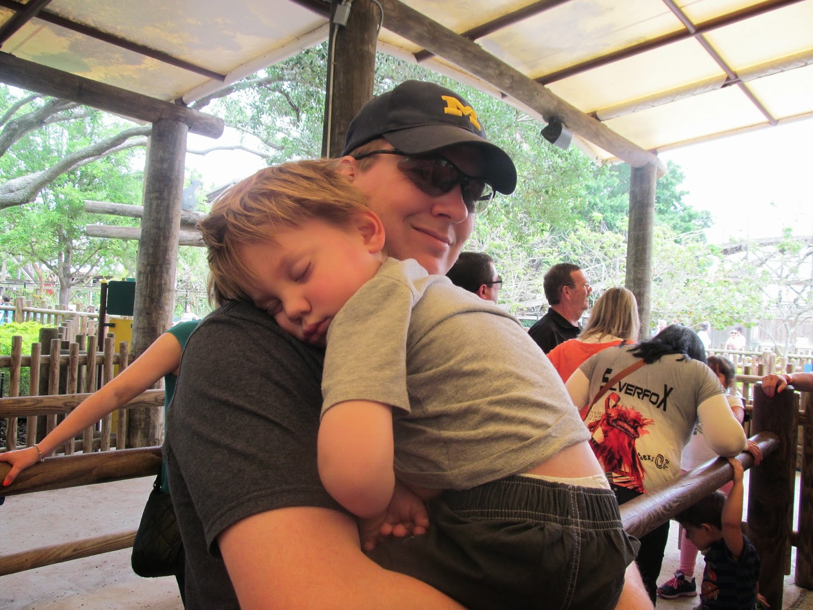 The kids were excited and we were excited to see them so excited. But the day was complicated by the fact that we started with one very sleepy little boy who needed to stay with us for eight more hours. We had gotten our tickets for the park for a steal (thanks to going to a timeshare presentation) but that also meant standing in line for longer to validate our voucher. We were also fighting a slew of school kids and home school kids who were there for the day. When I'm on spring break I have a hard time remembering that other people are still in school, even with a niece and nephew who are visiting back and forth because they have school this week. We finally decided that it would be best for us to rent a stroller to avoid carrying tired kids (ours didn't fit in the car for the drive down). It took awhile to get E to get into the stroller, but our decision was eventually validated.